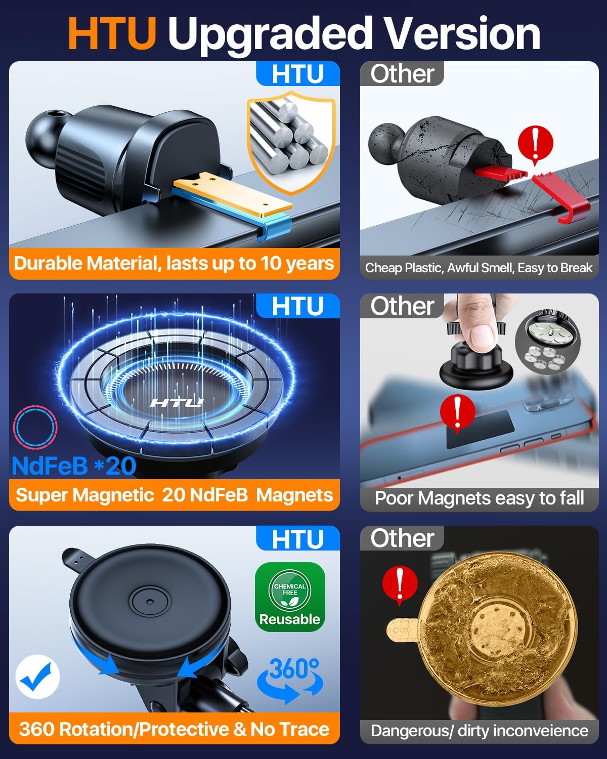 - [2025 Original Design, Magnetic Holder Expert Compatible for Magsafe] Optimizing 17 models and testing 156 kinds of material. HTU R&D team designs the [Strong Magnet, 360Β° Rotatable & Alloy Suction Cup ] windshield dashboard magnetic car phone mount for MagSafe. Industry-only made of Solid Aluminum Alloy & KING of Plastic is certified by CE, RoHS, CP65