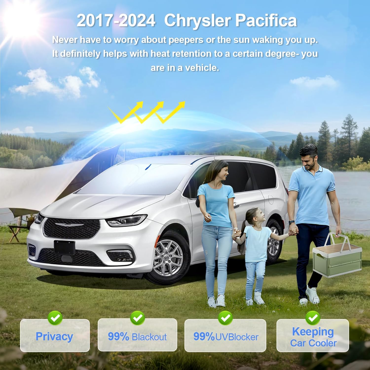 - Designed specifically:SHINELINERS full window sunshade is specially designed for Chrysler Pacifica 2017 2018 2019 2020 2021 2022 2023 2024 2025.Provide your car with comprehensive UV and infrared protection, not only keeping the interior cool in hot weather but also extending the lifespan of the car's interior