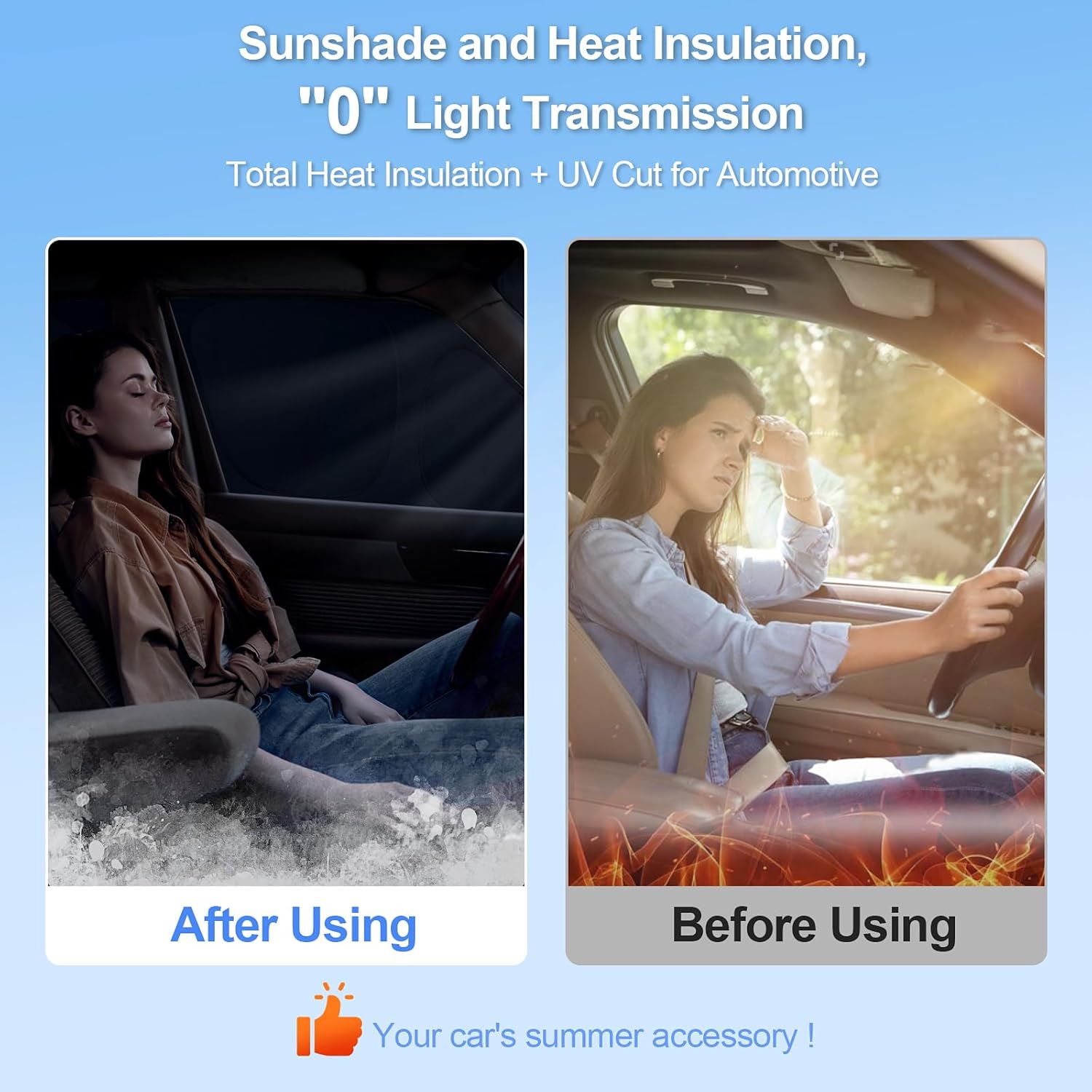 - 99% Sun Protection & Heat Reduction:Double-layer heat shield blocks 99% of harmful UV rays and reduces interior temperature by up to 40°F.Prevents "hot car" syndrome – no more burning steering wheels or suffocating heat when you enter.Say goodbye to scorching seats and steering wheels!
