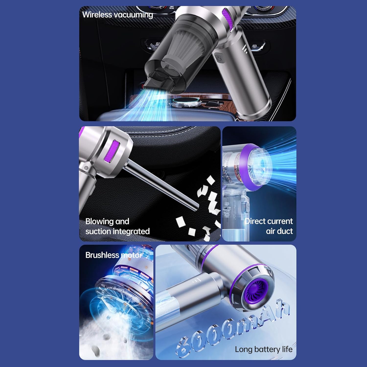 - 【Versatile 4-in-1 Design】More than just a vacuum cleaner, this car vacuum is equipped with a variety of accessories that can blow, vacuum and pump for a variety of scenarios, which is very helpful to reach small areas that a larger vacuum can't, it's perfect for removing dust, cleaning keyboards, inflating outdoor gear and deflating storage bags, anytime, anywhere.
