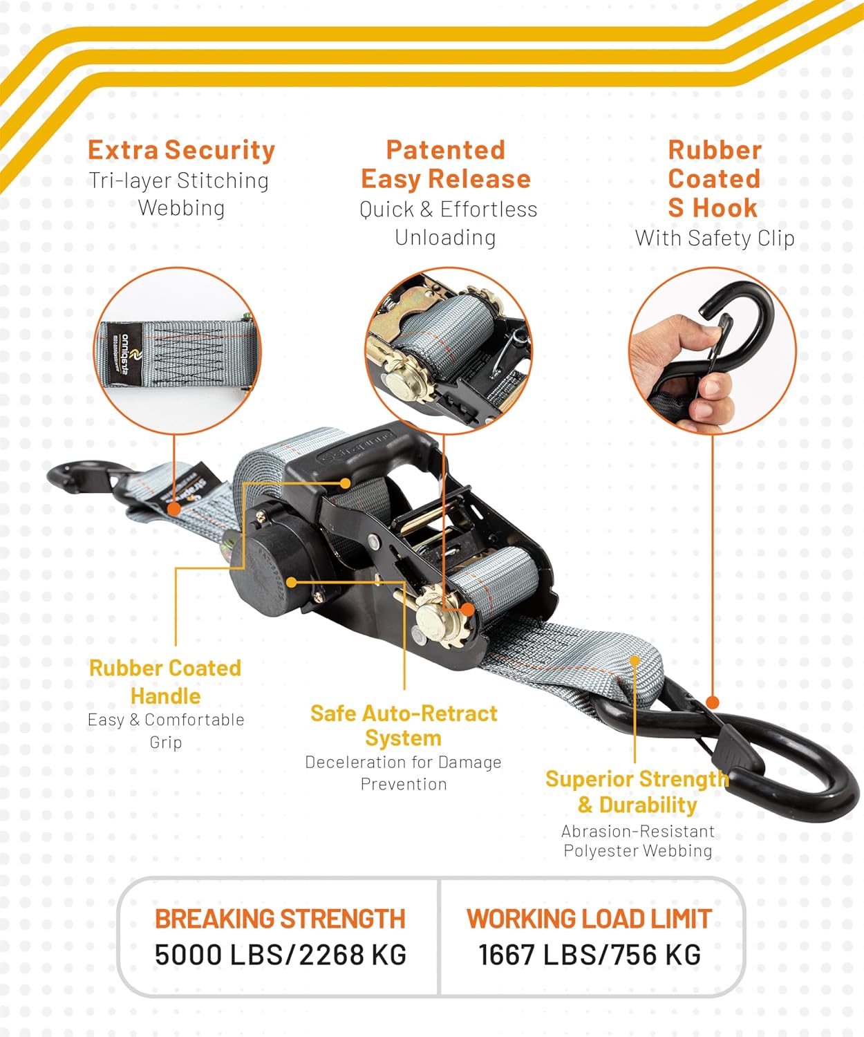 - Mighty and Versatile. With a Working Load Limit of 1,667lbs / 757 kgs and a Breaking Strength of 5,000lbs / 2,270kgs, our Heavy Duty Retractable Ratchet Straps are capable of handling even your heaviest loads. These straps are perfect for securing loads on your truck, trailer, roof rack, or any other cargo carrier. Use them to tie down ATVs, UTVs, motorcycles, furniture, lawn equipment, and more.