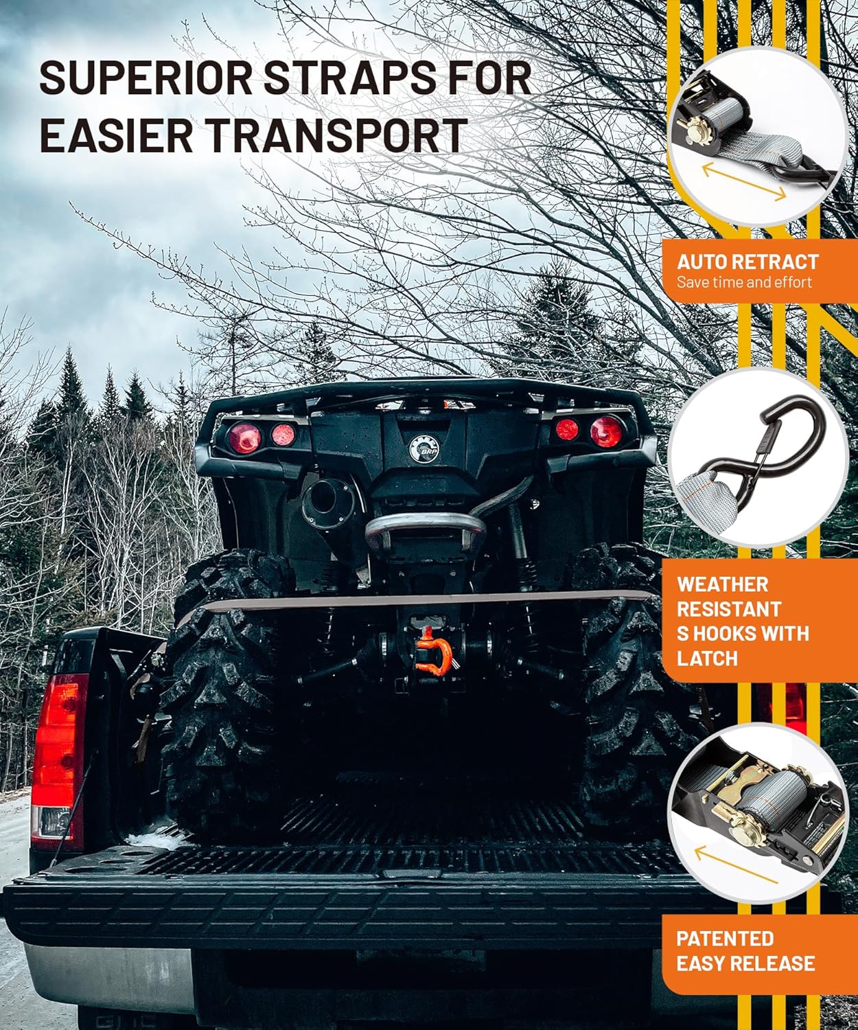 - Smooth Hauling. With our retractable ratchet straps, you'll feel like a pro with their easy-to-use design - simply open the handle, extend the strap to your desired length, latch it onto the S-hook, and ratchet tight for secure load fastening and unbeatable time-saving convenience.