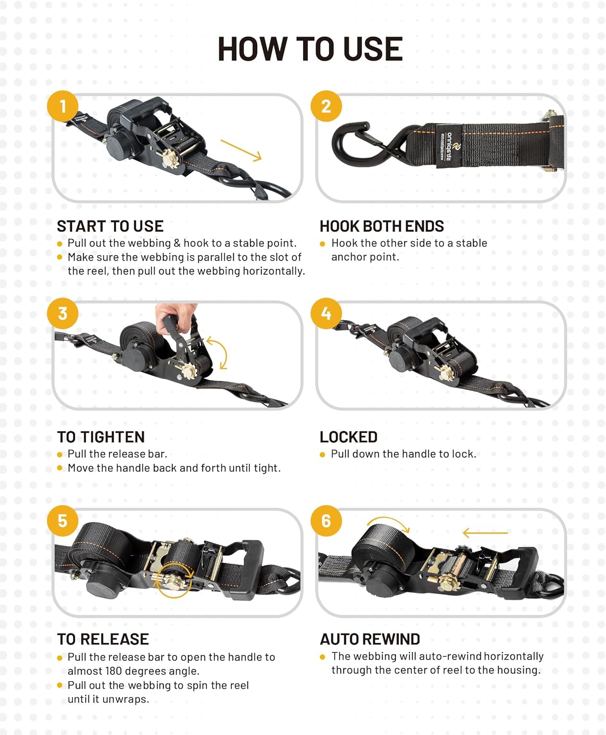 - Smooth Hauling. With our retractable ratchet straps, you'll feel like a pro with their easy-to-use design - simply open the handle, extend the strap to your desired length, latch it onto the S-hook, and ratchet tight for secure load fastening and unbeatable time-saving convenience.