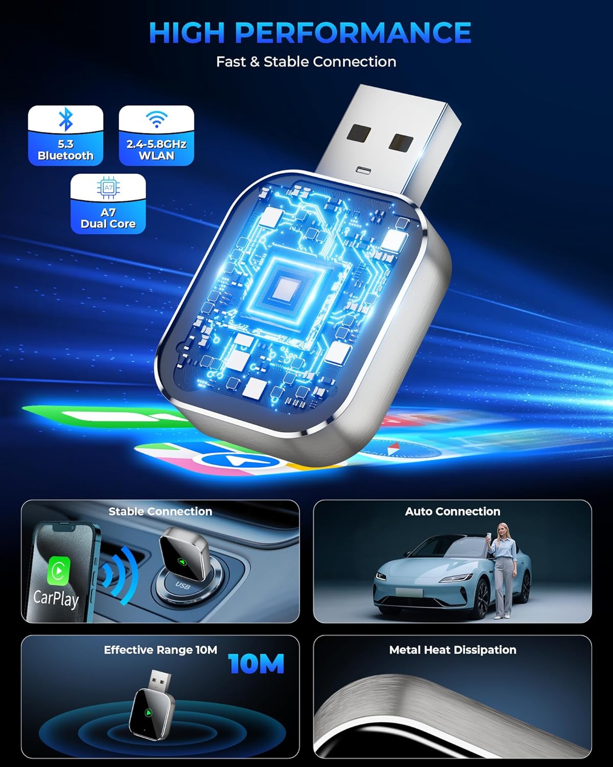 - Intelligent technology Fast and Stable Connection: Featuring A7s upgraded dual-band chipset for improved driving experience, the CarPlay wireless adapter for iPhone provides 5.3GHz Bluetooth and both 2.4GHz-5.8GHz WiFi connection. Enjoy fast and stable CarPlay performance for seamless music streaming, navigation, and hands-free calls