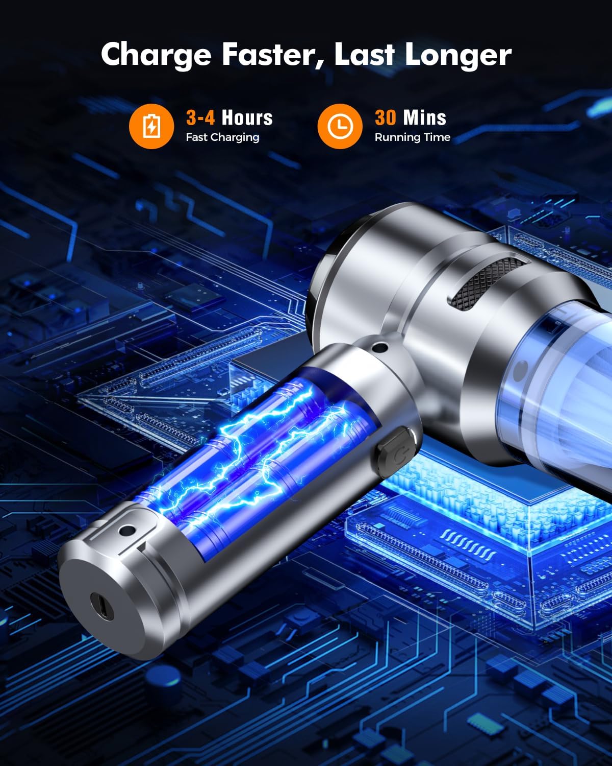 - 【Rechargeable Battery and Quick Charge】VNOST S7 Pro car vacuum has a built-in 6000mAH high-capacity battery. It can work continuously for 30 minutes in first gear. And with a fast charging port, the included TYPE-C charging cable makes it easy to use car chargers, mobile power and other methods to get a quick full charge .