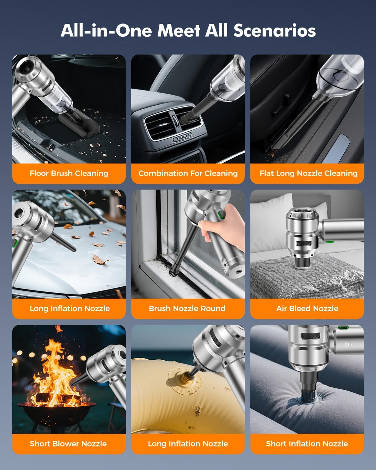 - 【4-in-1 Multi-function】VNOST S7 Pro wireless handheld car vacuum cleaner strong suction is equipped with nine nozzle attachments that combine vacuuming, blowing, inflating and extracting functions. Whether you need to clean your car's interior, inflate your swim ring, or perform vacuuming to extract air, this car vaccum will meet your needs.