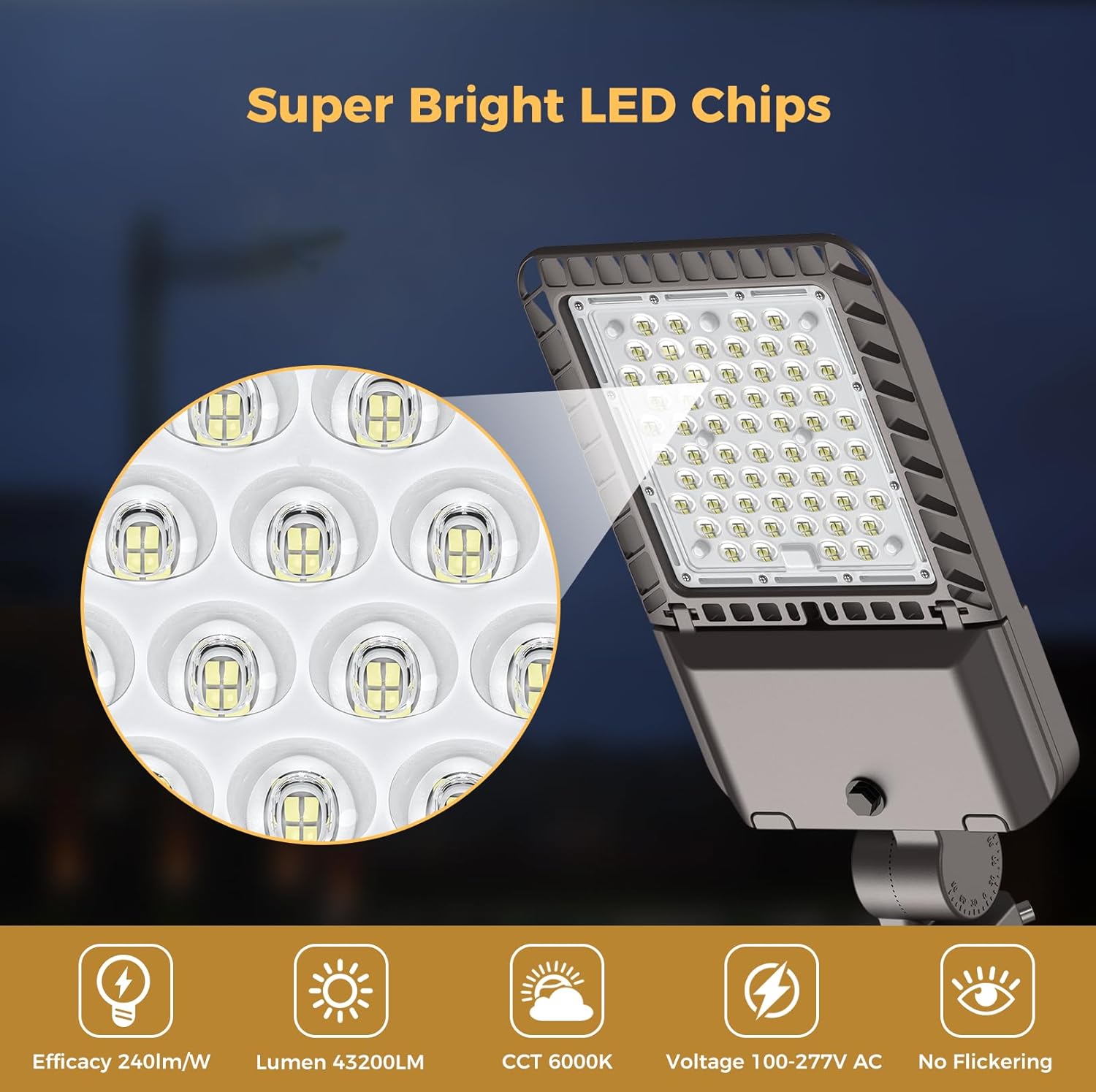 - Equipped with a built-in photocell sensor, this LED street lights automatically turns on at dusk and off at dawn, saving both time and energy by eliminating the need for manual operation. Please NOTE !!! This is NOT a solar light, this parking lot light needs electric power connection. And the dusk to dawn sensor can't be removed.