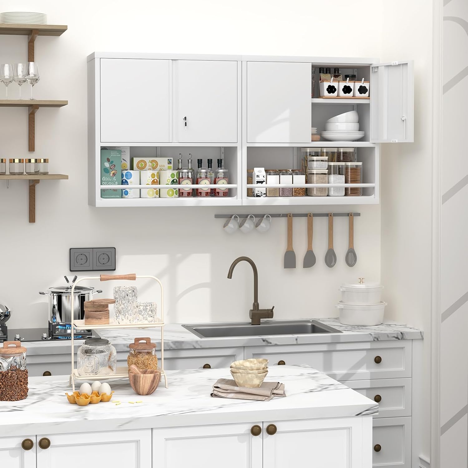 GREATMEET 31" H Locking Metal Garage Storage Cabinet with Doors and Shelves, Lockable Wall Cabinet Storage, White Steel Wall Mount Cabinet Hanging Floating for Office Utility Room