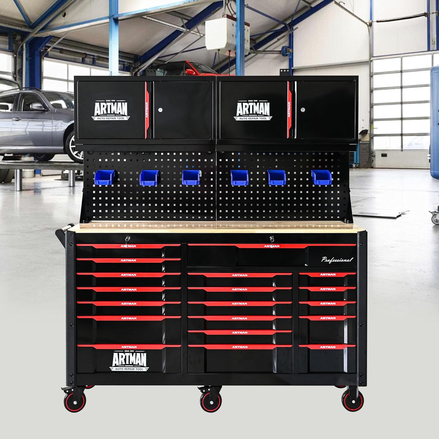 - 【Expansive Storage & Workbench Combo】 Maximize tool organization with this rolling tool cabinet featuring 19 deep drawers compartments.The reinforced top instantly converts to a sturdy workbench with drawers, letting you repair automotive parts or assemble furniture without cluttering your garage floor. Tools stay visible and accessible, cutting search time by 50%
