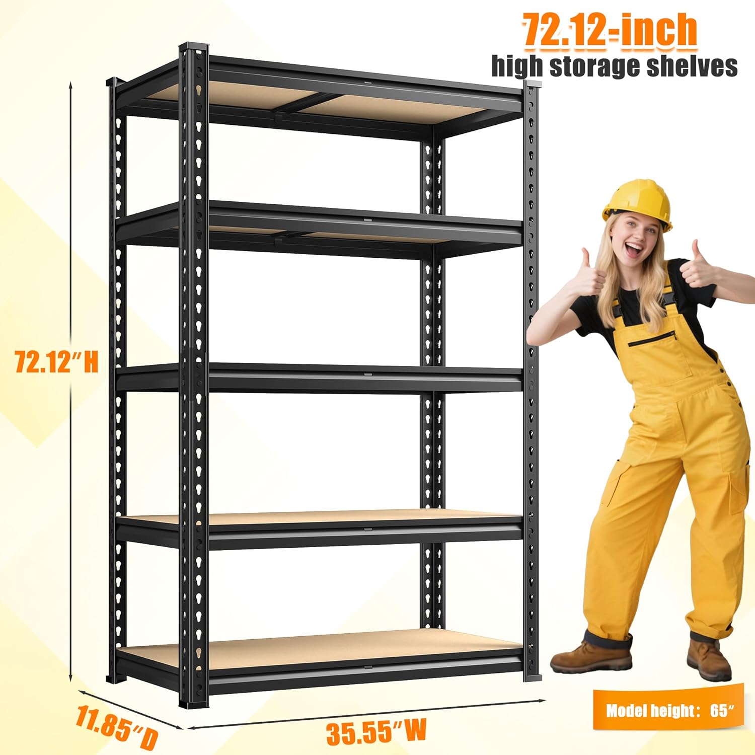 72.12" H Garage Shelving, Storage Shelves Load 2100LBS, 5-Tier Adjustable Shelving Unit with Thickened Wooden Boards for Multiple Scenarios, 72.12" H x 35.55" W x 11.85" D, Black, 2 Pack
