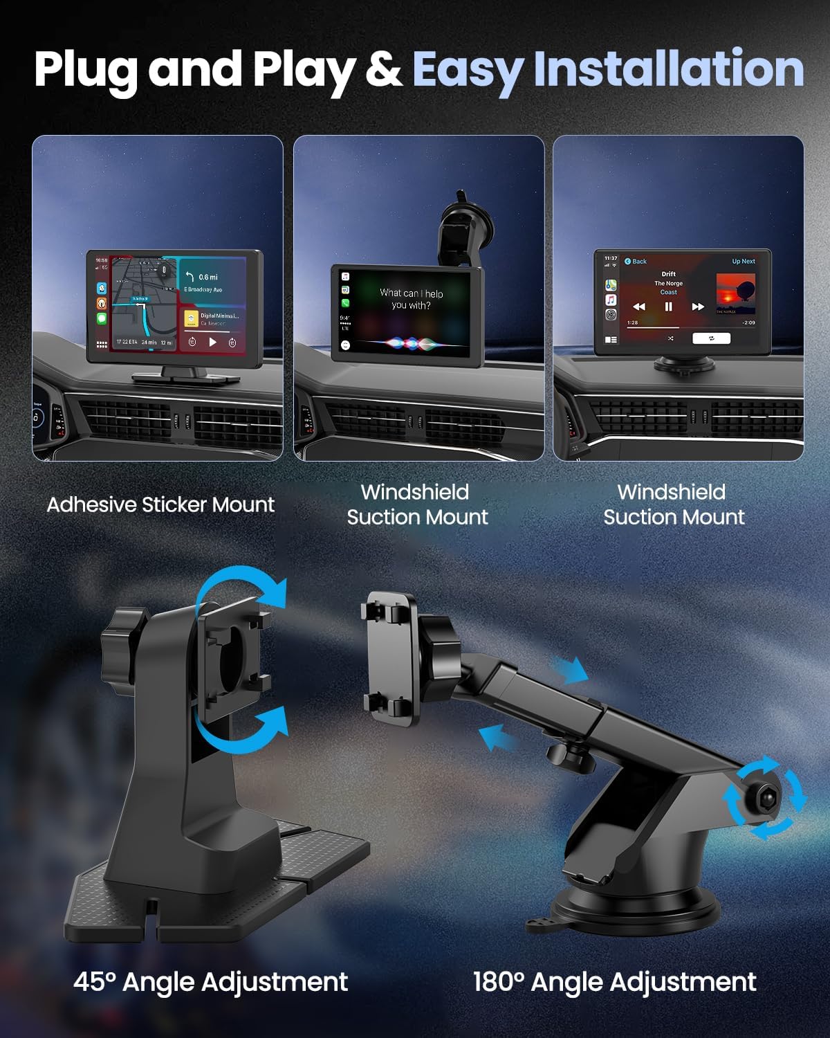 - Easy Installation: The wireless CarPlay features an extendable suction cup bracket and a self-adhesive bracket, allowing for secure attachment to your dashboard or windshield. Enjoy the convenience of easy detachment and reinstallation. Simply plug it into your car's cigarette lighter socket to get started instantly