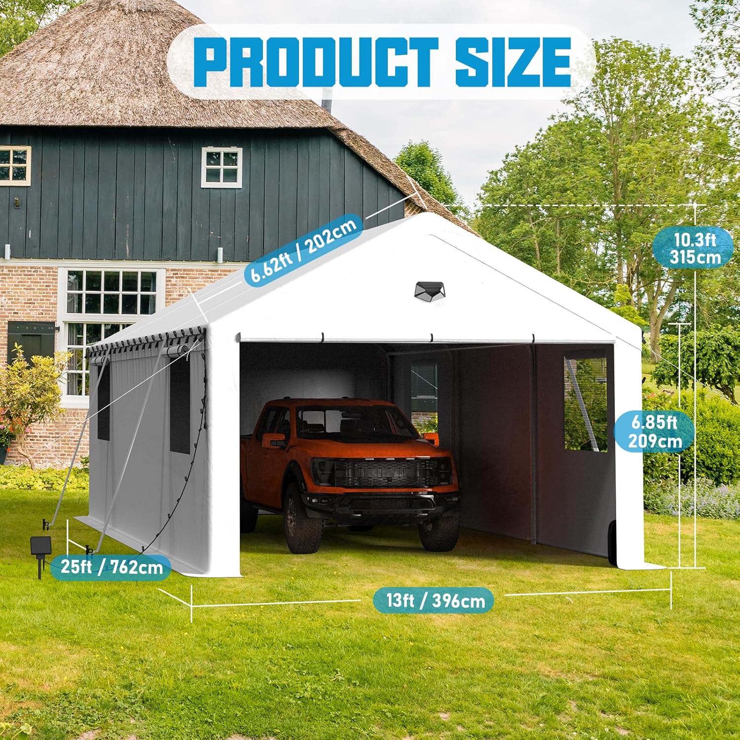 - Large Capacity Carport - The size of this car port is 25'L x 13'W x 10.33'H, which provides ample room for you to park car or other vehicles, even you can use it as warehouse