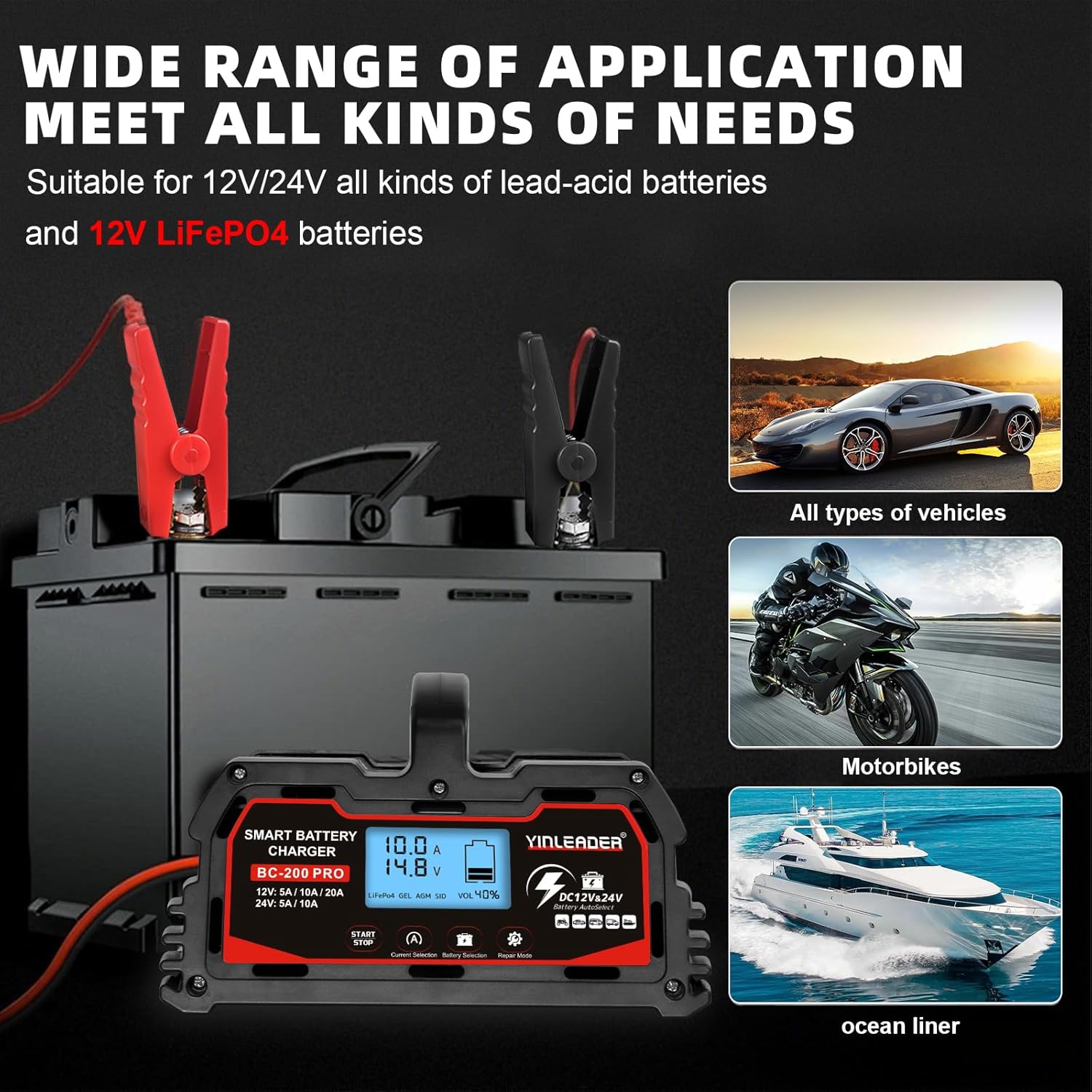 - Wide Range of Applications: It offers a variable charging current of (12V-5A/10A/20A)/(24V-5A/10A) battery charging, allowing you to choose the appropriate current for your battery size. Suitable for charging and repairing lead-acid batteries, including AGM, STD, GEL, SLA, etc, in cars, trucks, SUVs, motorcycles, lawnmowers, boats, and more.