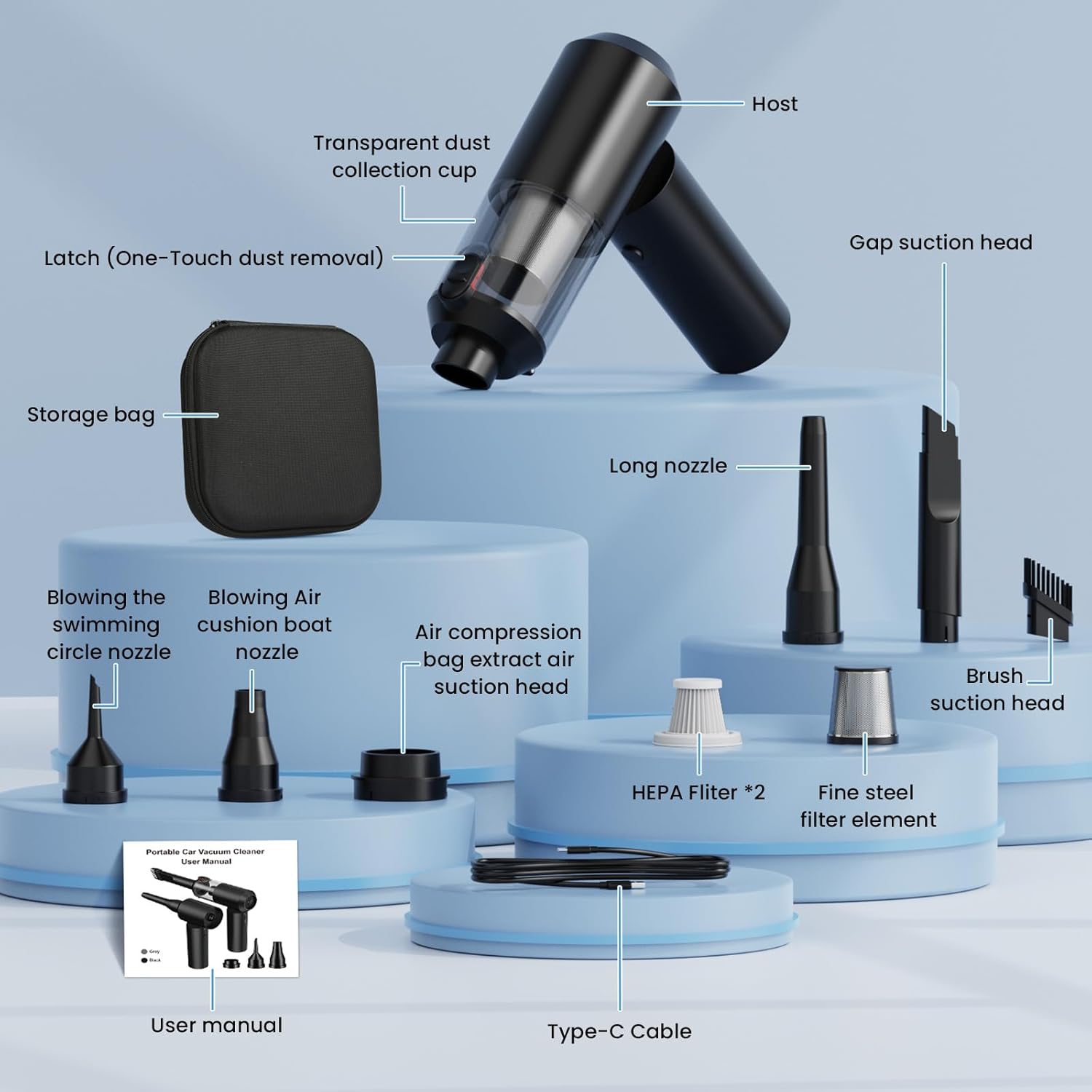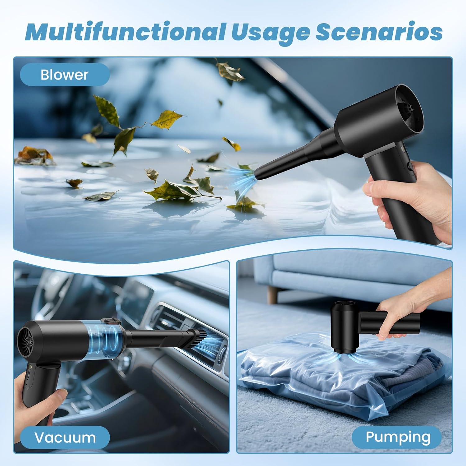 - 【4IN1 Air Duster and Vacuum Cleaner and Blower】Our Vacuum is equipped with a variety of accessories that can meet the blowing, vacuuming and pumping. You can use it to easily blow away dust and other particles from the surface of your items, as well as to suck out the tiny stubborn dirt hidden in keyboards and crevices. It can be used to clean your house, vehicle, and pet hair as well as inflate life rings or air bed. Additionally, it can serve as a compression bag pump when storing clothes.